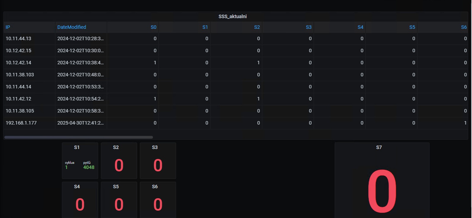 Jako datový zdroj slouží SQL pohledy nad tabulkami systému. K vlastní vizualizaci je použito open-source prostředí Grafana.